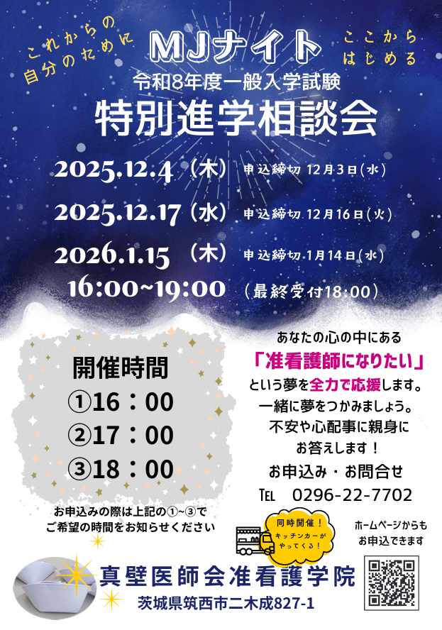 真壁医師会准看護学院では、入試にこと、学院での生活のこと、奨学金のこと、就職のことなどのご相談を承っております。